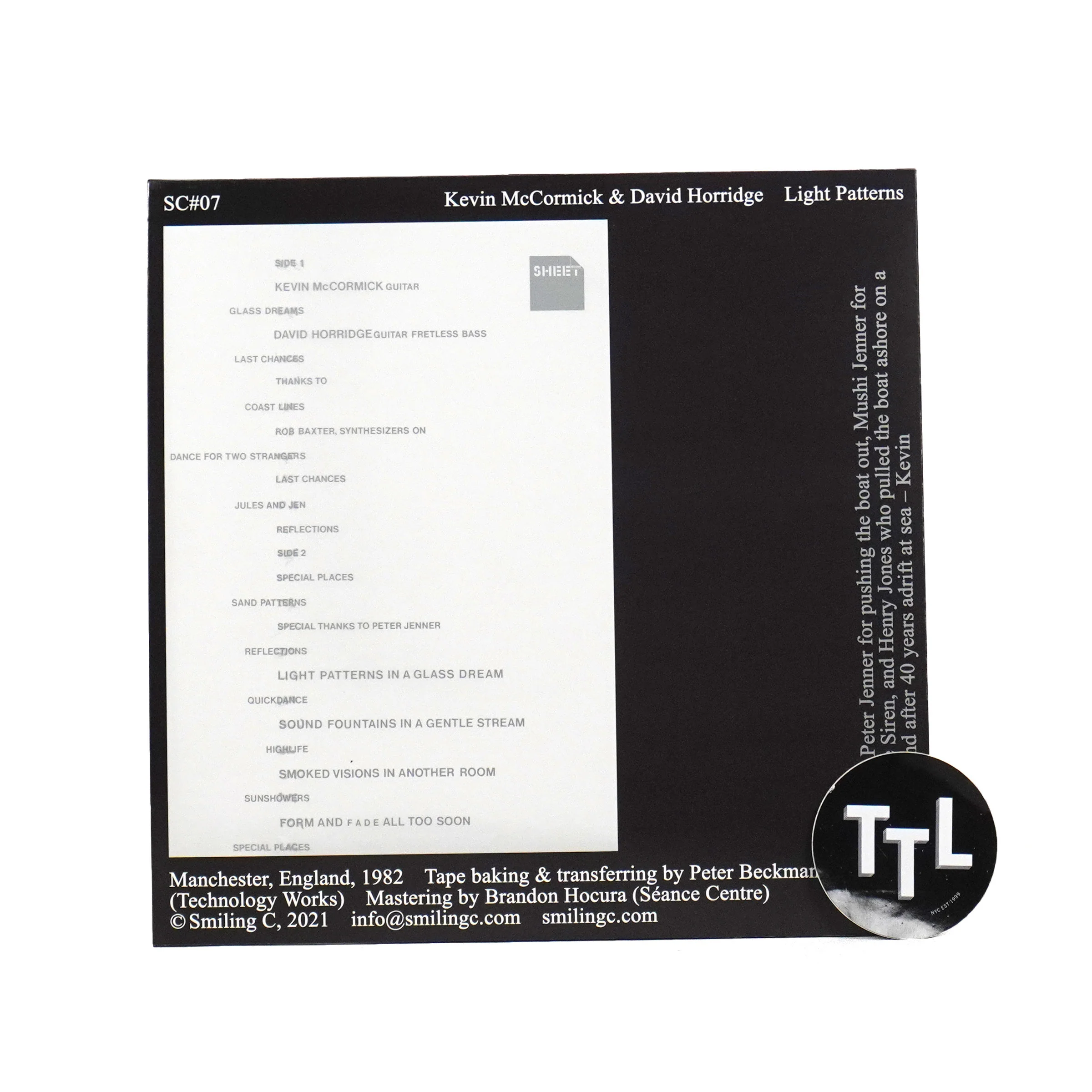 "In 1970, Kevin and David met whilst they were working in the Labour Exchange Office on Aytoun St, Manchester. Both played guitar and had been searching for other musicians who played atmospheric music. In the late 70s, the music scene in Manchester was bursting with new bands and music. Kevin and David, however, had little in common with the local acts, being disciples of a more meditative approach. They followed a path of their own, reaching for an otherworldly sound that they heard from artists like John Martyn, David Crosby, Erik Satie, Terry Riley, Eberhard Weber, Alice Coltrane, and Ralph Towner. They experimented combining their acoustic guitars and David’s bass with various effects pedals and techniques to try and achieve a warm and expansive sound that rides the line between ambient, jazz, and psychedelic folk Music. Towards 1981, they had written eleven songs and accompanied a few with Moog synthesizer laid down by Rob Baxter. All were recorded on cassette decks in their simple home studios. They named this collection of music Light Patterns, after a poem Kevin had written. We’re excited to make Light Patterns accessible again for the first time in nearly 40 years, remastered from the original tapes. As the original press release said, 'Put the album on, lie back and enter the land of no floors'." - Smiling C